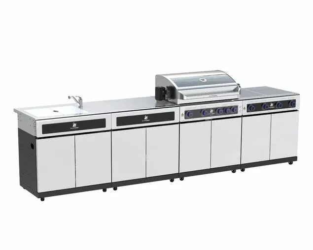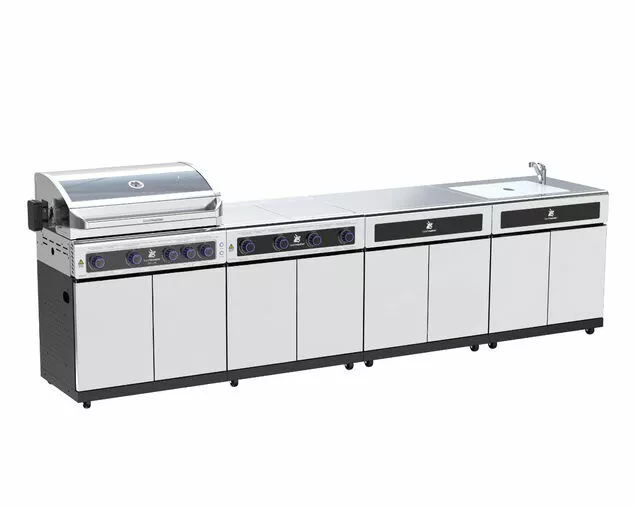 Design the ultimate outdoor kitchen and BBQ your way with Beefmasters range of add-on kitchen components; Deluxe Range, Bench & Sink. The Beefmaster Outdoor Kitchen suits outdoor spaces of every shape and size, each model comes in 3 different sized cooking systems: 2 Burners, 4 Burners or 6 Burners. Designed to stand alone or matched with our outdoor kitchen modules, build the perfect BBQ Kitchen for your home with Beefmaster’s unique modular customisation. This Kitchen Island is one of more than 85 possible variations of building your own customised outdoor kitchen island. If you have further inquiries call our nearest store for detailed information.