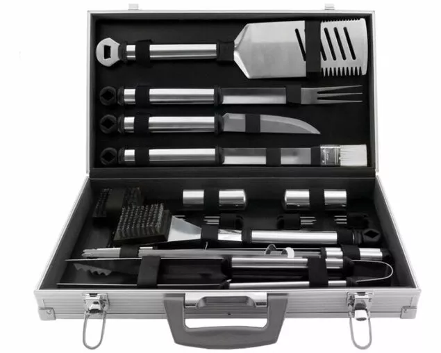 Grill like a pro with this tool set, includes everything you need to get the barbeque fired up. Includes spatula, fork, tongs, basting brush, knife, cleaning brush with replacement head, 8 x corn holders, 4 x skewers, salt & pepper shakers. Includes durable aluminium case for easy storage.