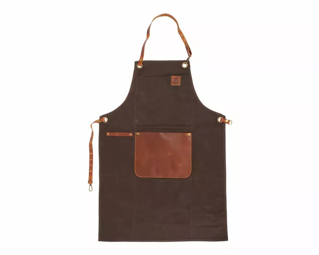 Waxed canvas, heavy duty and water resistant apron with genuine leather straps.