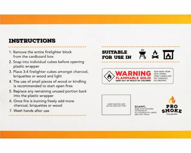 Pro Smoke Natural Fire-lighters, made from all natural materials. Completely odourless with no impact on taste. Easy to use, suitable for barbeques, open fires and indoor heating.